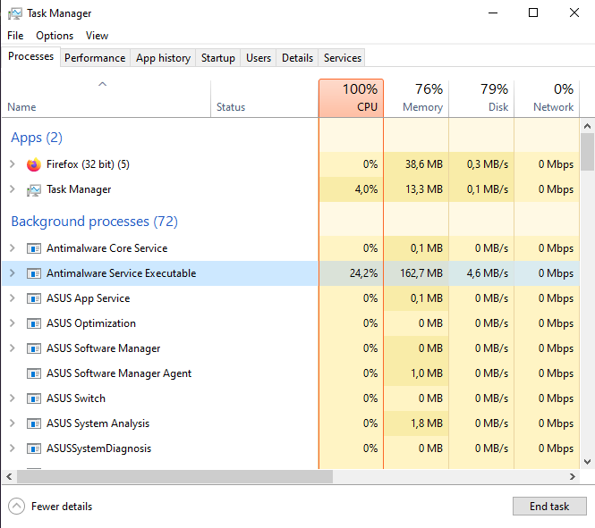 Setiap kali laptop baru menyala atau baru saja selesai booting, usage CPU, RAM, dan Disk selalu tinggi (seringkali menyentuh 90-100%), dan tersangka utamanya adalah “Antimalware Service Executable”, yang tidak lain adalah bagian dari Windows Defender.